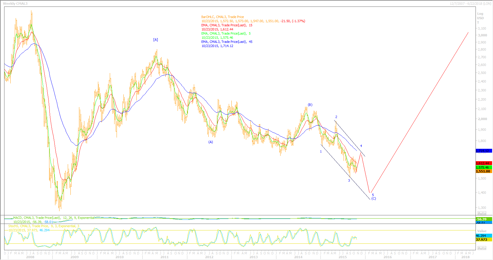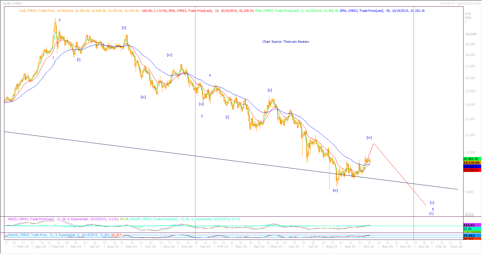 Here we are in 2016 and it seems so far that the call made 6 months ago is translating into reality. Again being in early stages of a trend, things are always open to sudden changes. In Copper key level as of now stands at the Jan 2016 low 4318. In the near term, price is expected to drift lower, however it should not break below 4318. In below charts the possible path identified in yellow lines. In a more bullish scenario price might hold above 4631. A break through 5438 would add a confirmation of an established uptrend. As long as price is trading below that figure, an alternate bearish scenario would call for another dip in prices later in 2016. As of now, we keep that on plan “b” basis and it would come into play only if price breaks 4318 to the downside.
